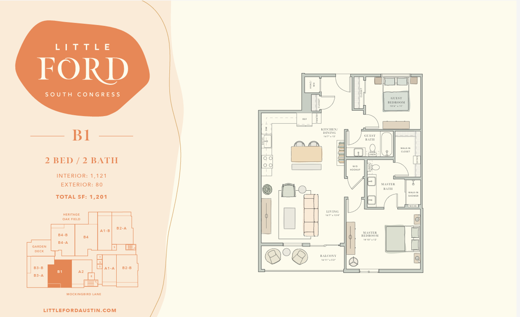 Little Ford is a small collection of single-level homes beside a private creek-side field, along the burgeoning South Congress corridor of South Austin. Centrally located, Little Ford provides easy access to Austin’s most established commercial districts and community parks & trails. Outdoor amenities include a community “back yard” with entertaining kitchen, grill, fire pit, dog park, and a walking trail among large heritage oak trees. The second floor features an elevated deck with lounge seating and community garden planters overlooking the field and tree-lined creek. All homes feature open kitchen/living floor plans, primary bath suites with double vanities & walk-in showers, and expansive covered terraces for outdoor living. Resident parking is gated and covered, with secure elevator access to floors above.