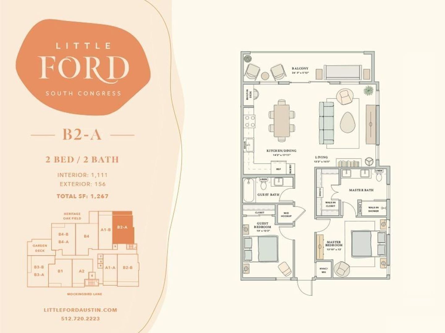 Little Ford is a small collection of single-level homes beside a private creek-side field, along the burgeoning South Congress corridor of South Austin. Centrally located, Little Ford provides easy access to Austin’s most established commercial districts and community parks & trails. Outdoor amenities include a community “back yard” with entertaining kitchen, grill, fire pit, dog park, and a walking trail among large heritage oak trees. The second floor features an elevated deck with lounge seating and community garden planters overlooking the field and tree-lined creek. All homes feature open kitchen/living floor plans, primary bath suites with double vanities & walk-in showers, and expansive covered terraces for outdoor living. Resident parking is gated and covered, with secure elevator access to floors above.